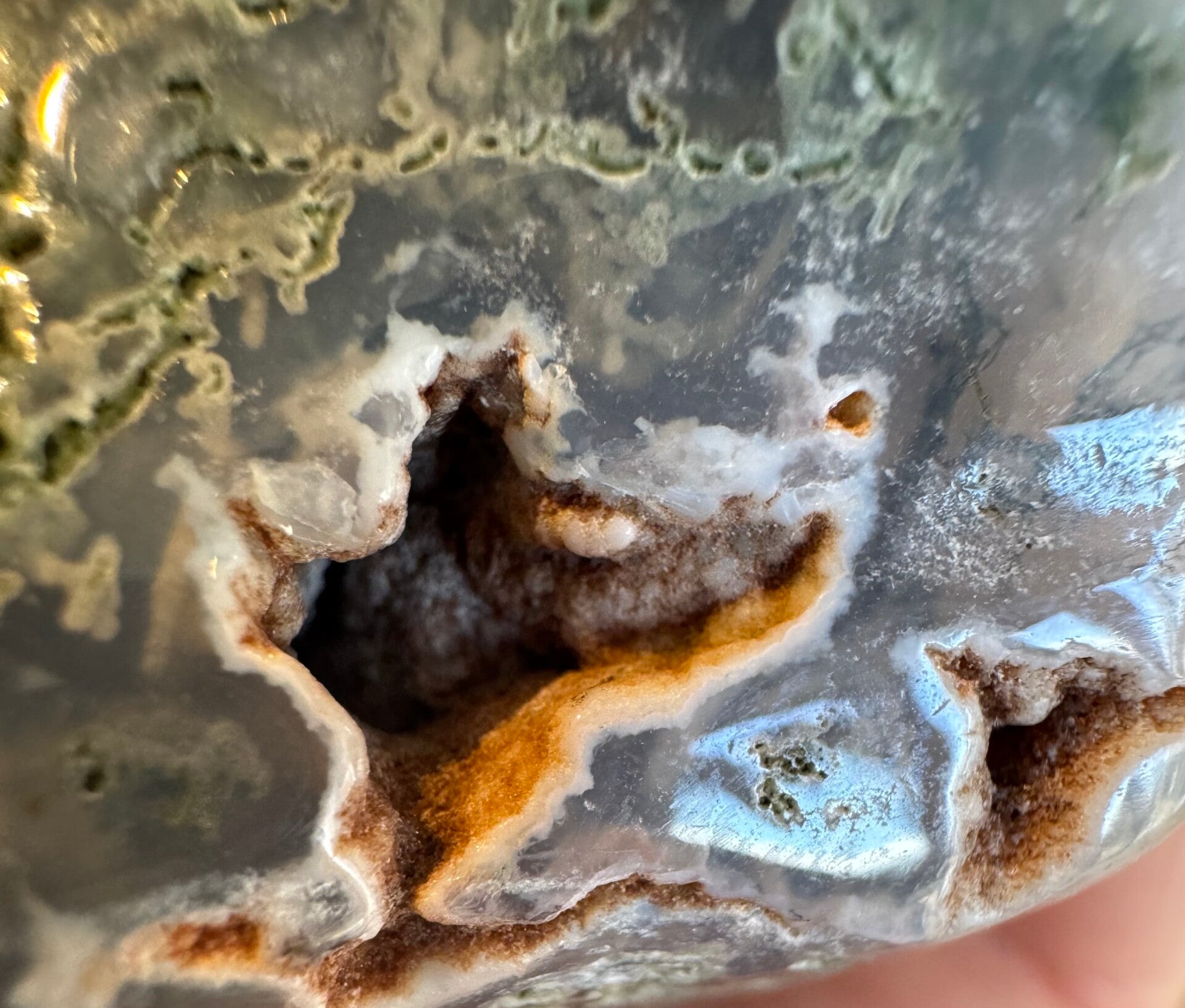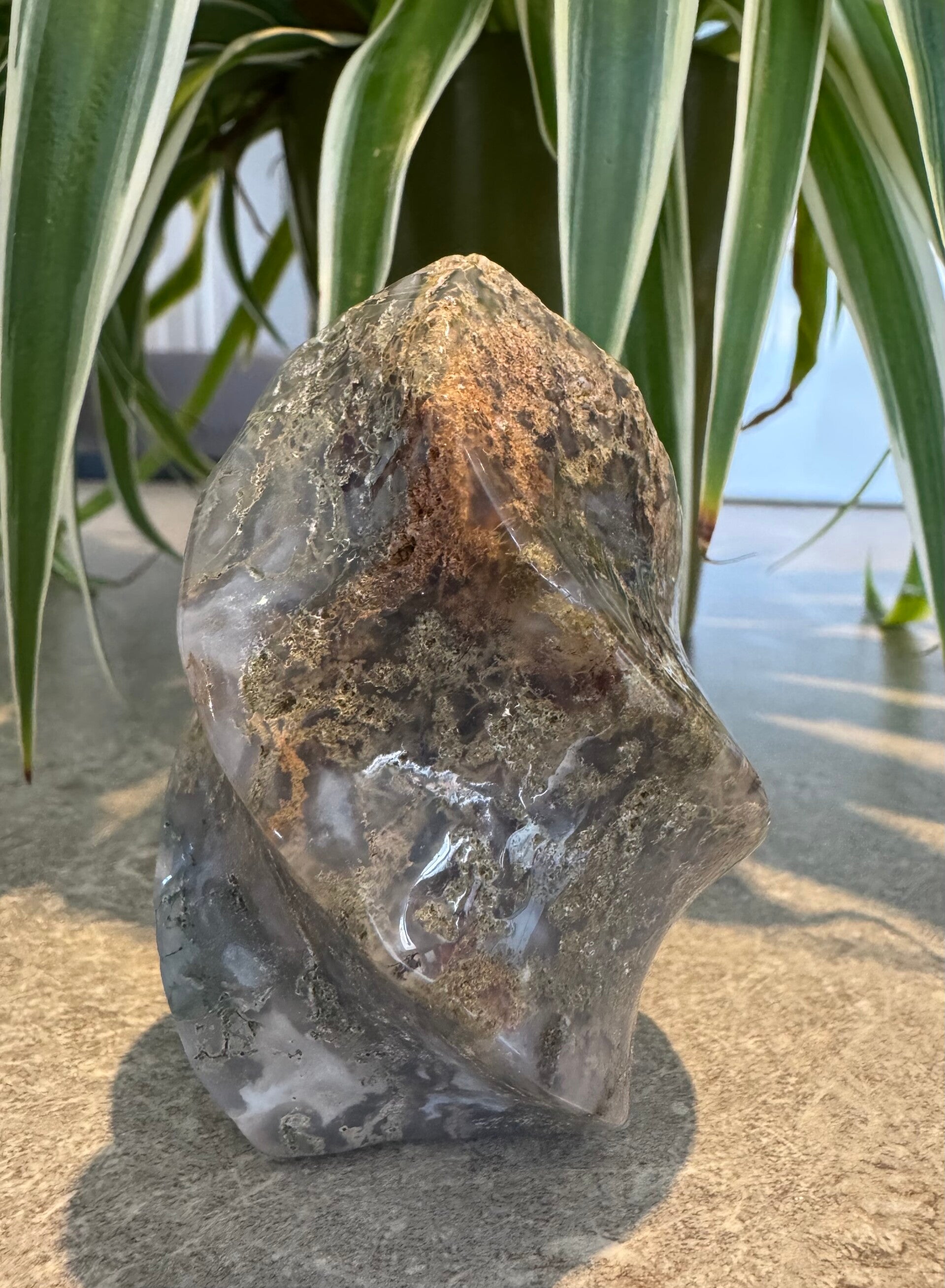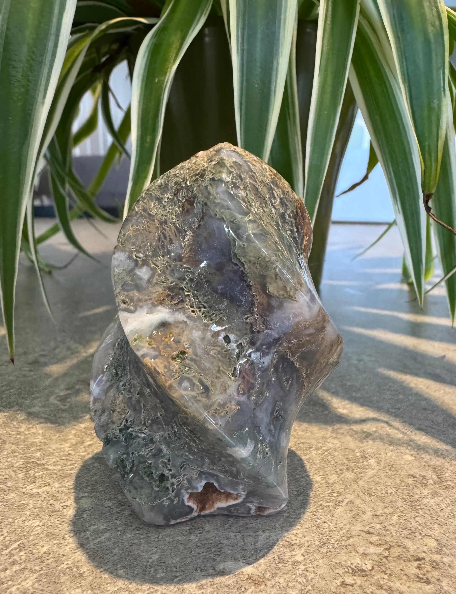 Moss agate is a powerful stabilizing, grounding, and abundance-attracting stone known for fostering emotional balance, mental clarity, and physical healing.