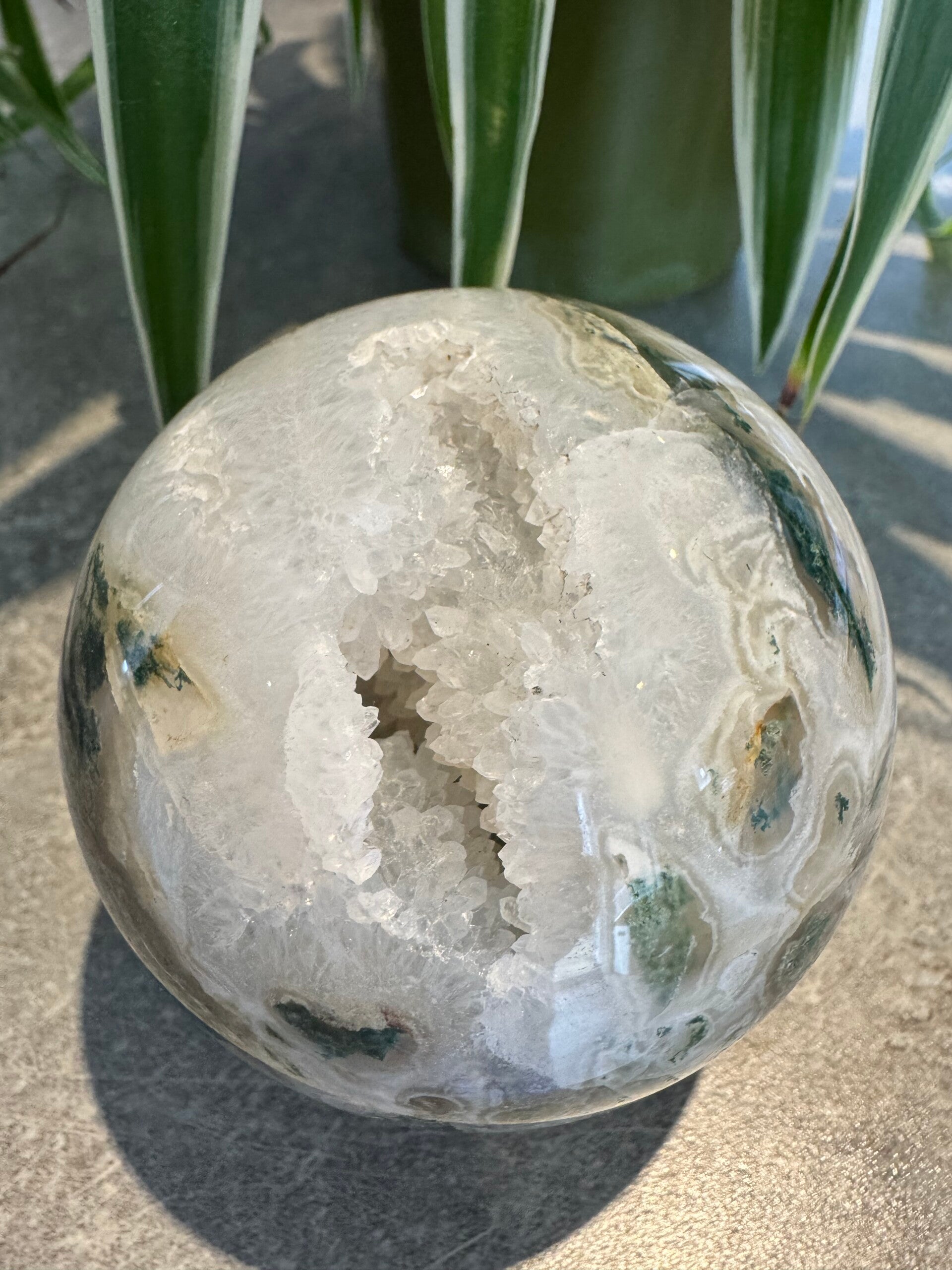Stunning Moss Agate Sphere with Druzy sectionsWeight 546 grams Size 7.4cm