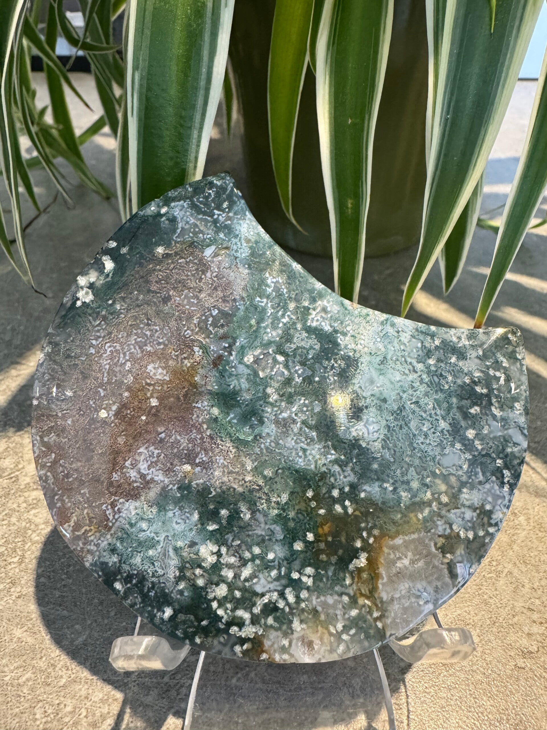 Stunning Red and Green Moss Agate Moon with plastic Stand