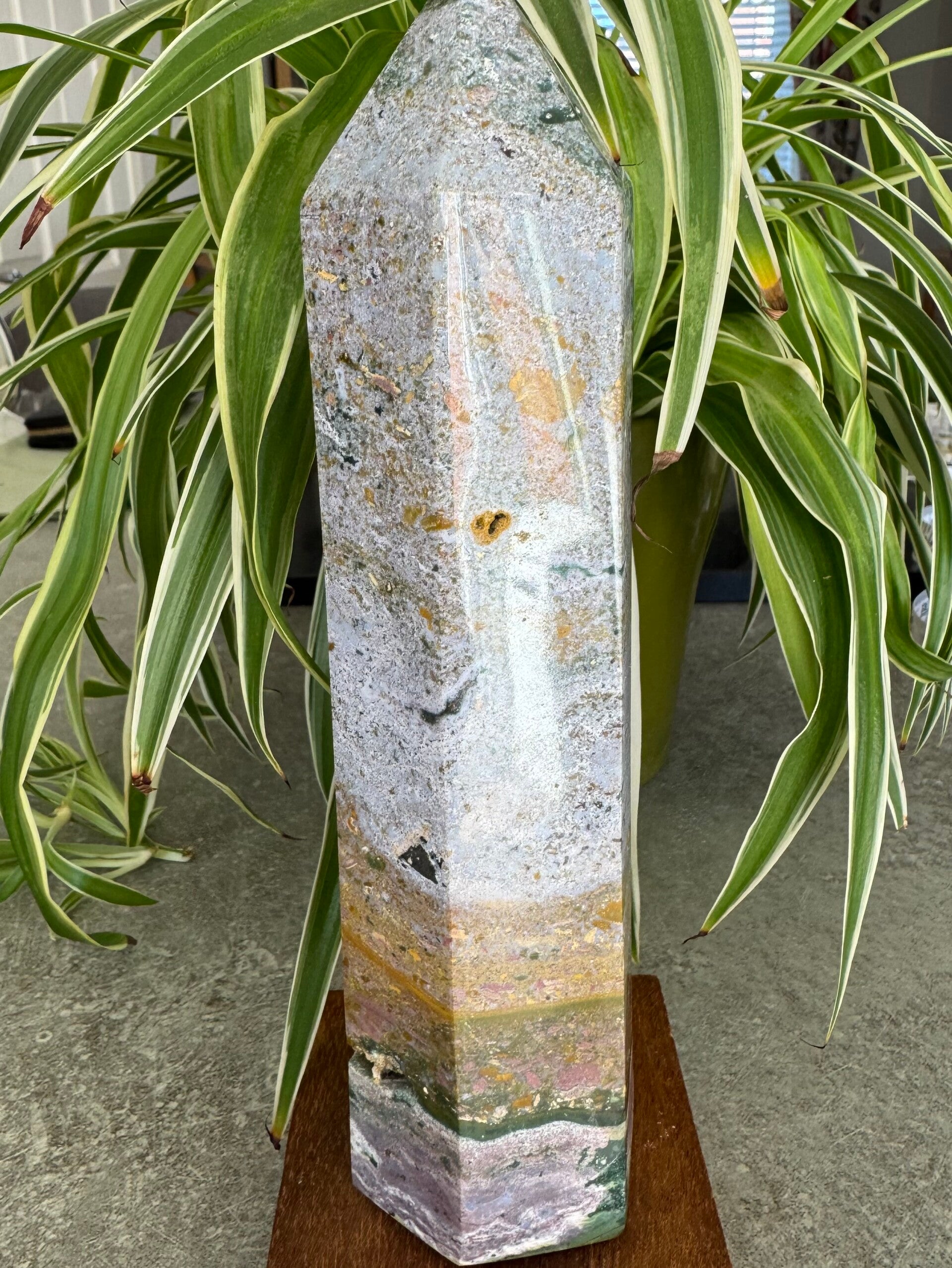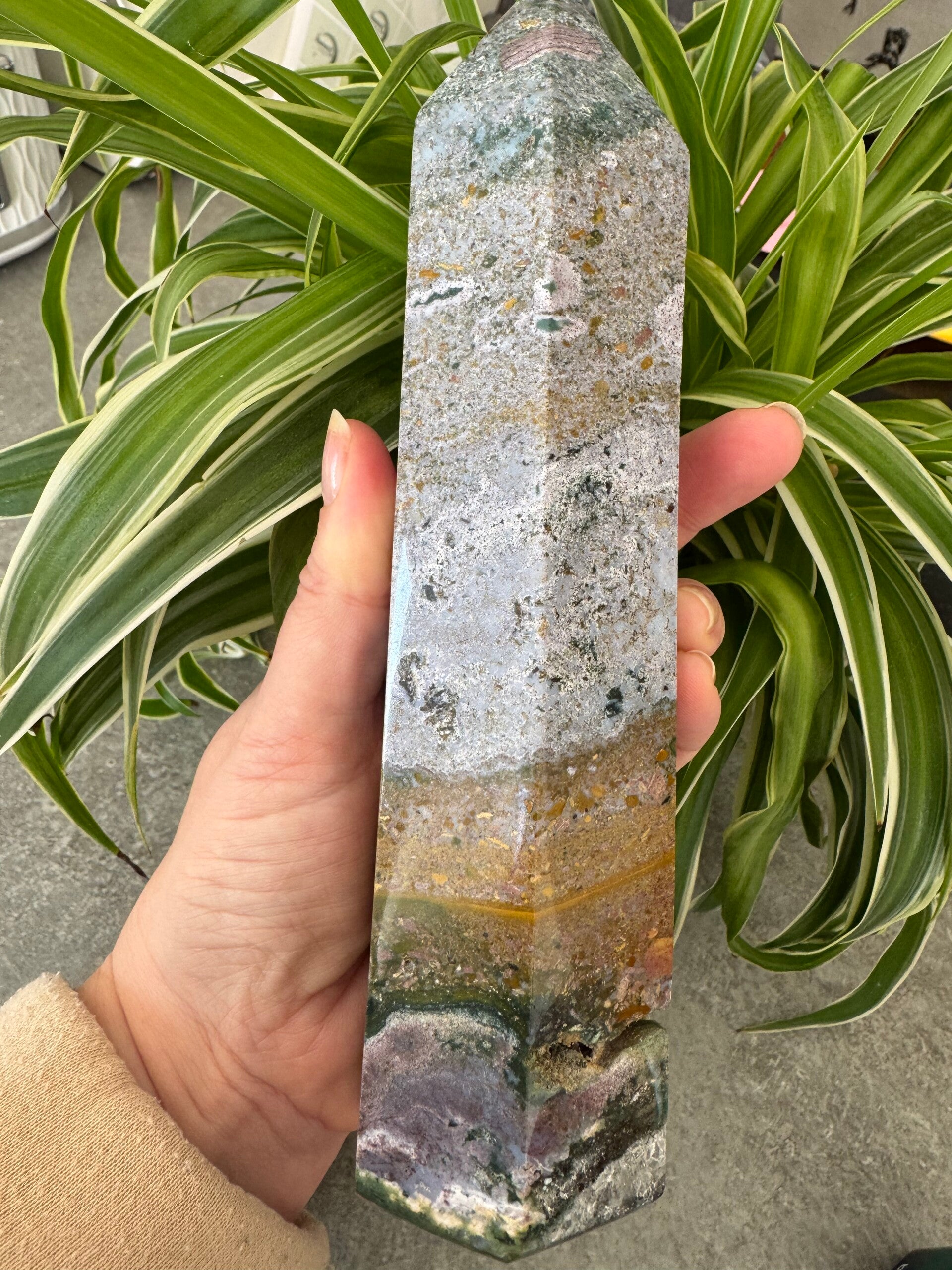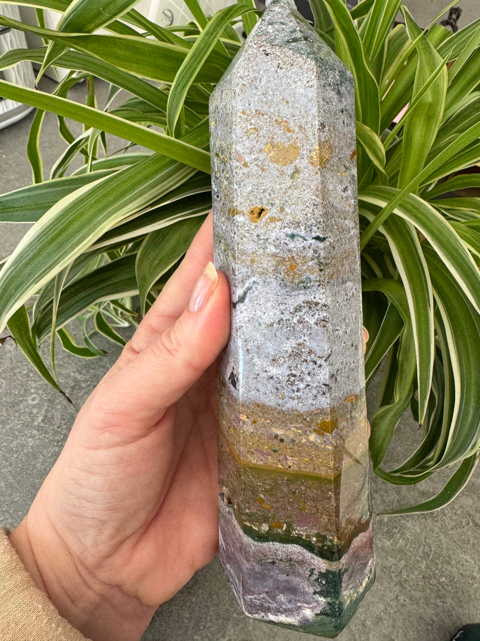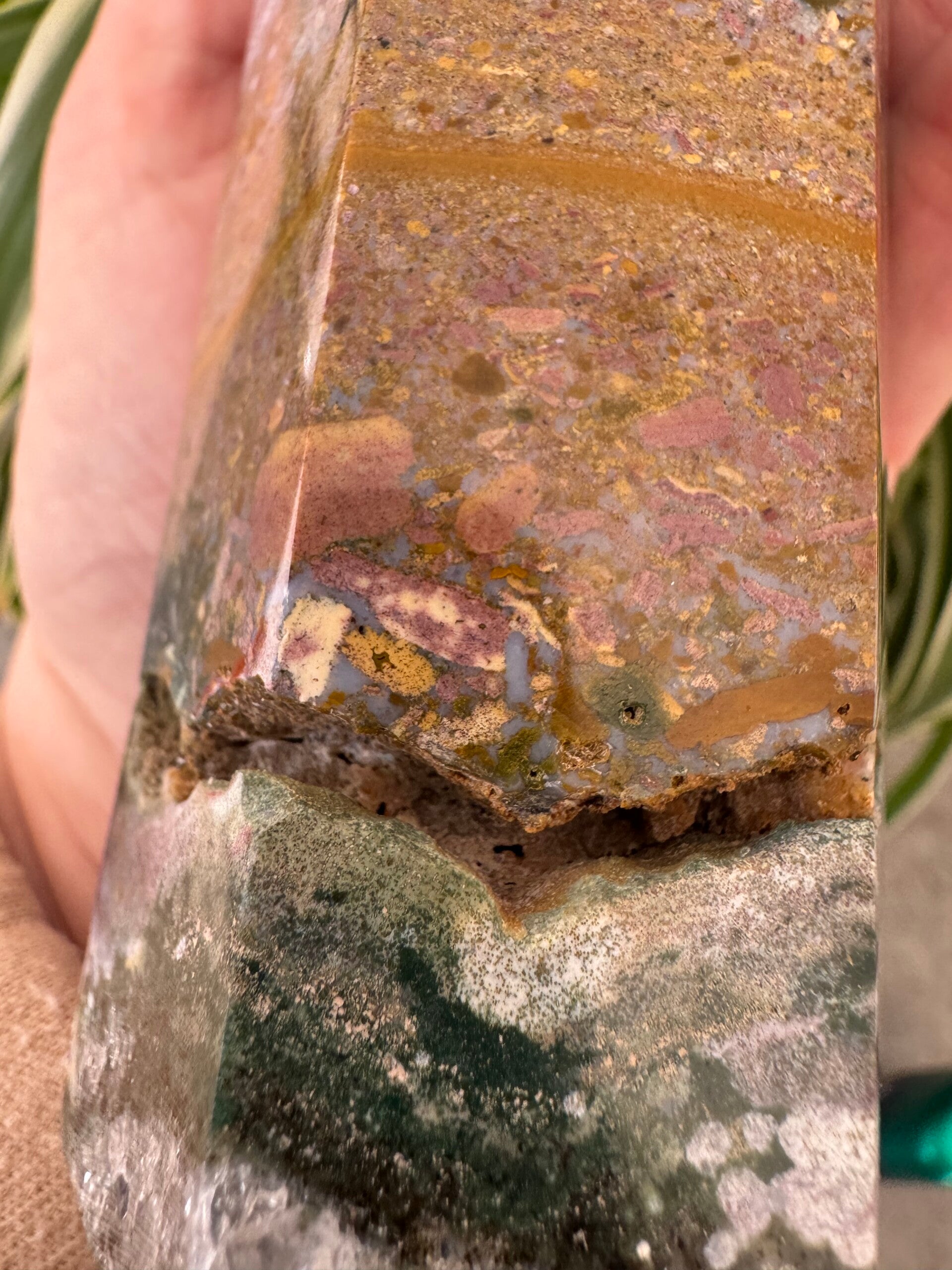 Ocean Jasper is a rare, orbicular quartz found only in Madagascar, characterized by its soothing, watery energy that promotes joy, patience, and emotional healing.