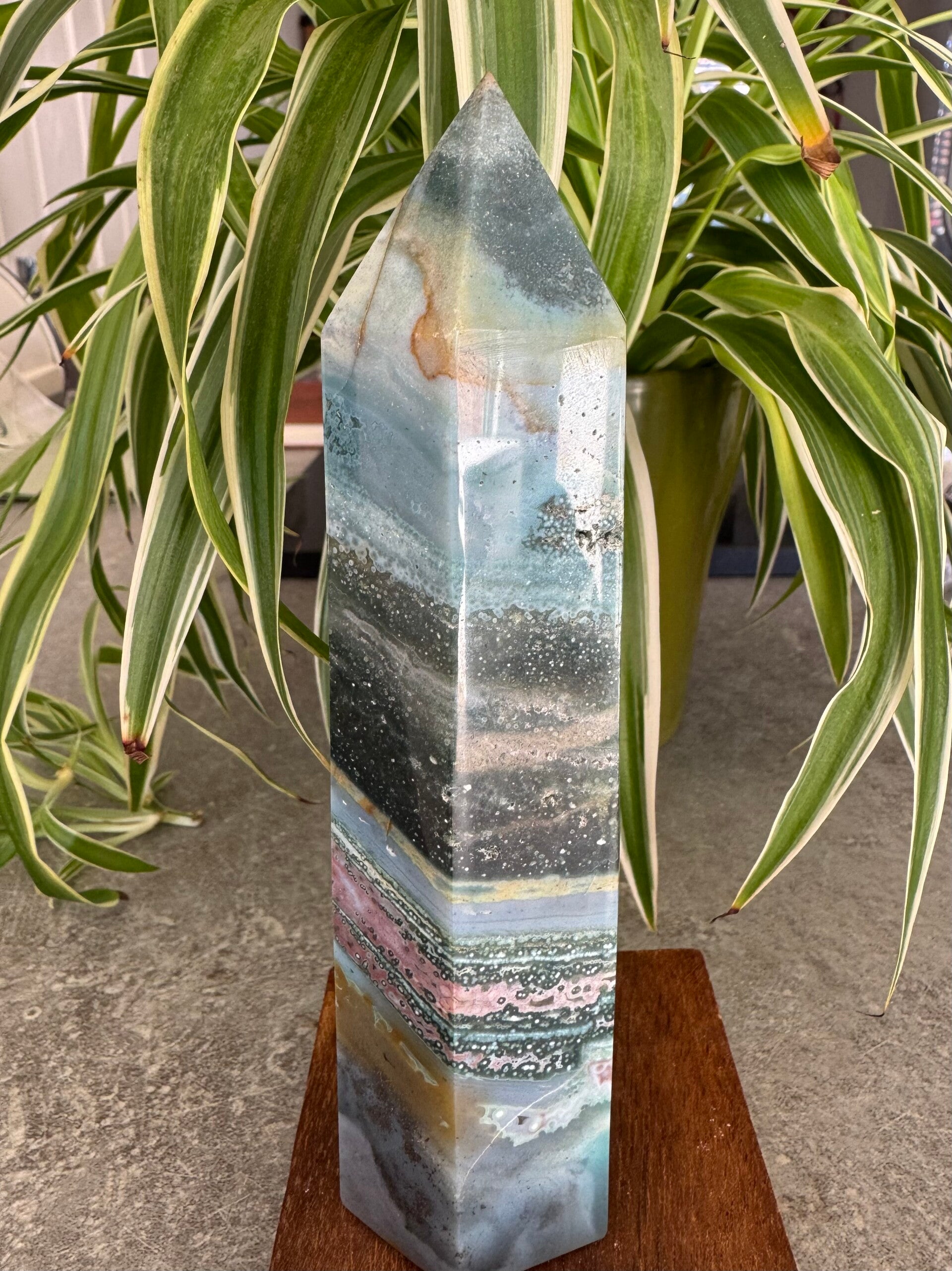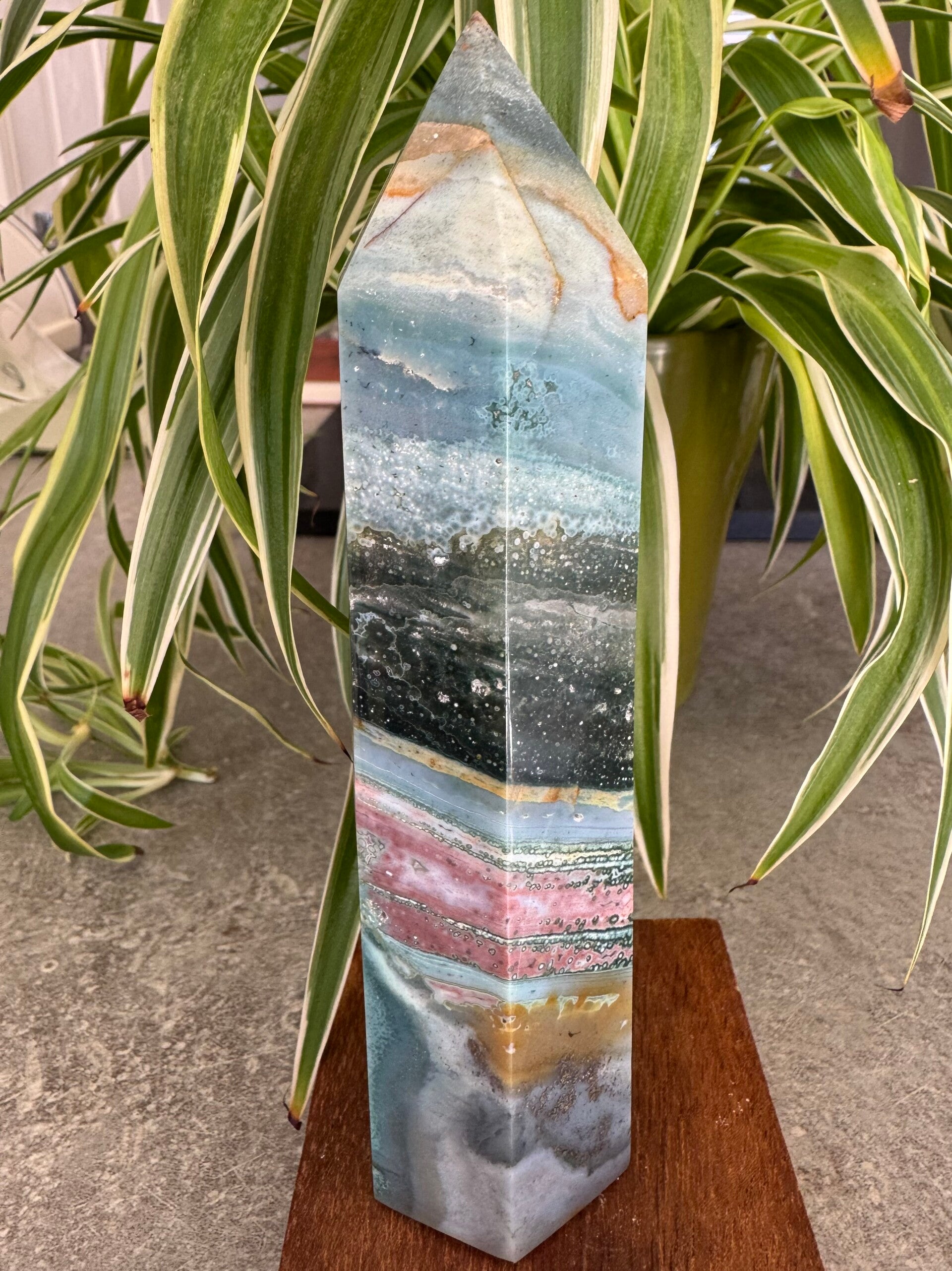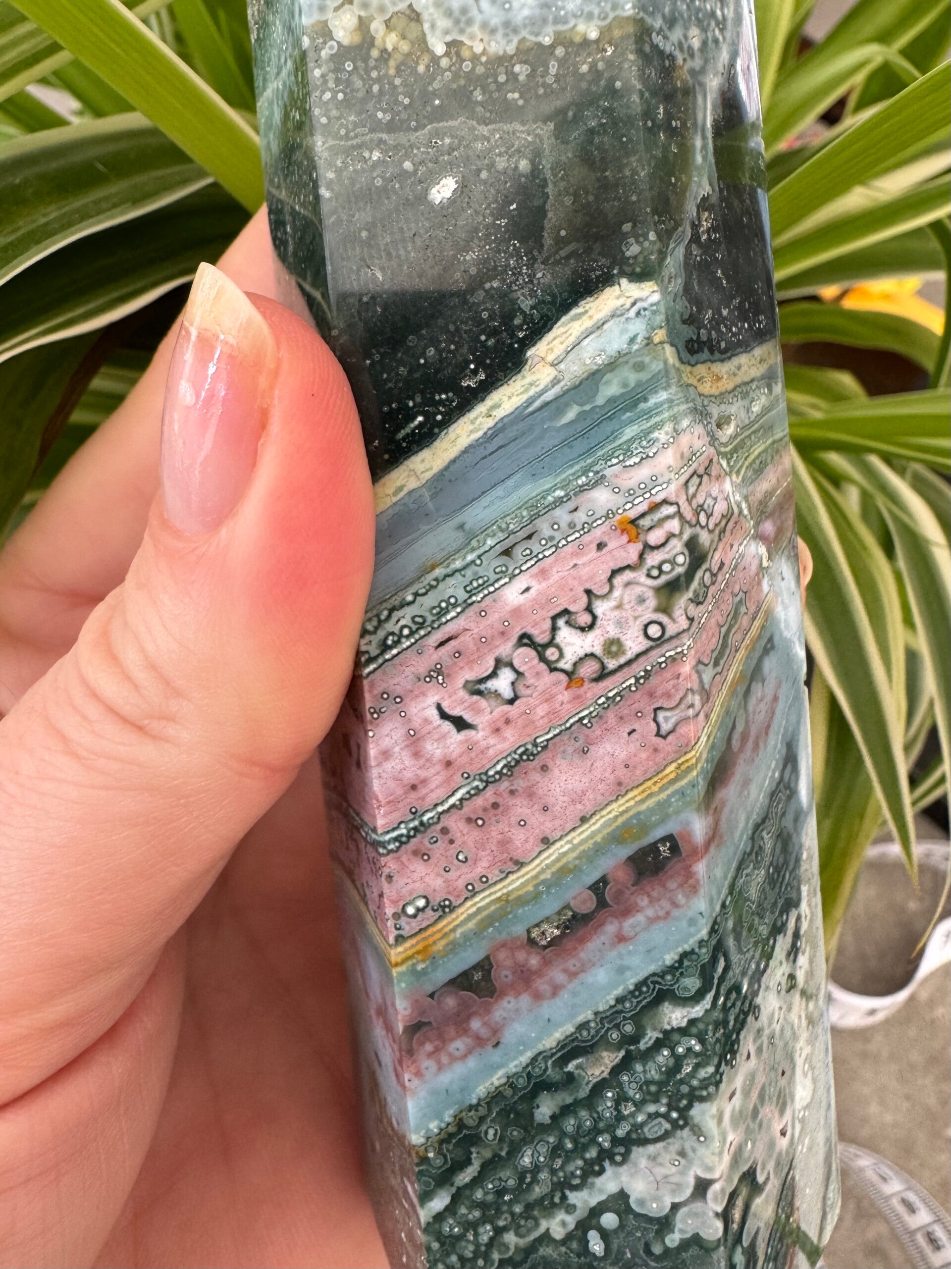Ocean Jasper is a rare, orbicular quartz found only in Madagascar, characterized by its soothing, watery energy that promotes joy, patience, and emotional healing.