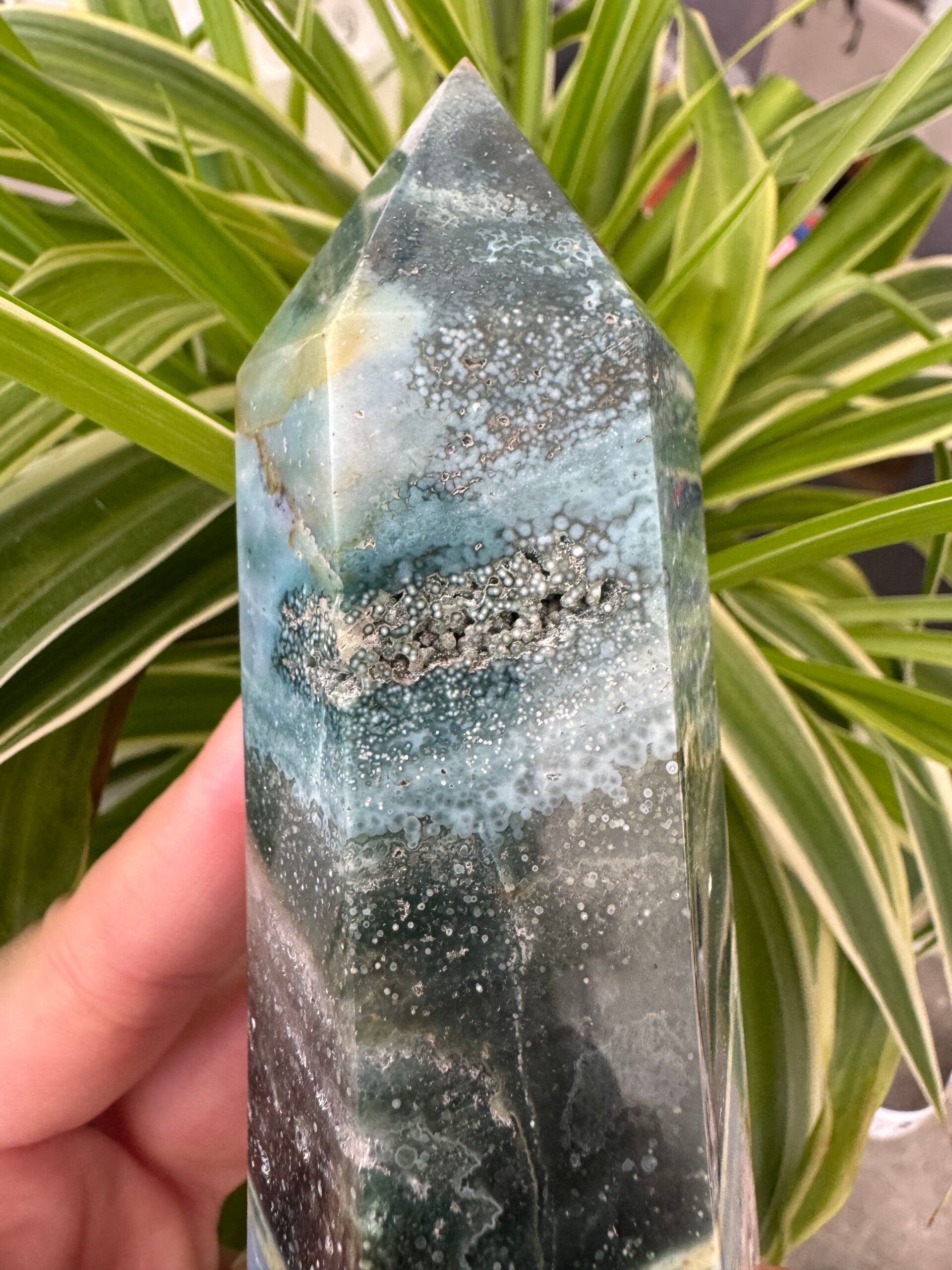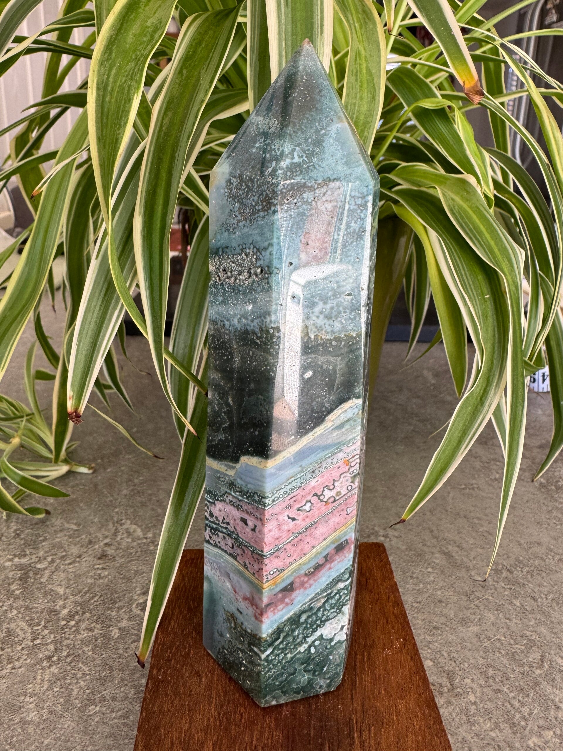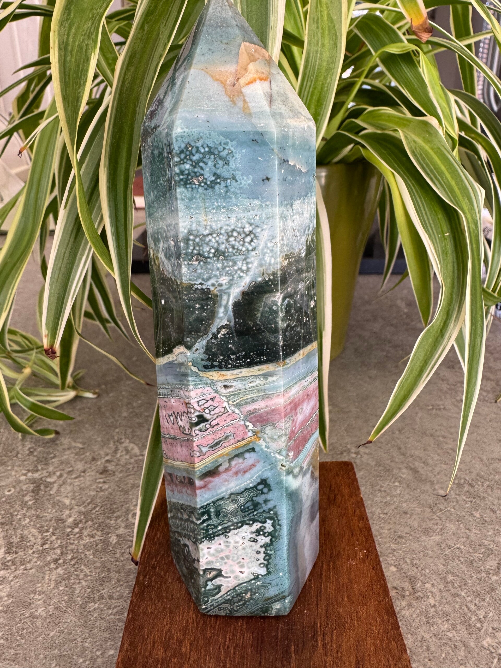 Ocean Jasper is a rare, orbicular quartz found only in Madagascar, characterized by its soothing, watery energy that promotes joy, patience, and emotional healing.