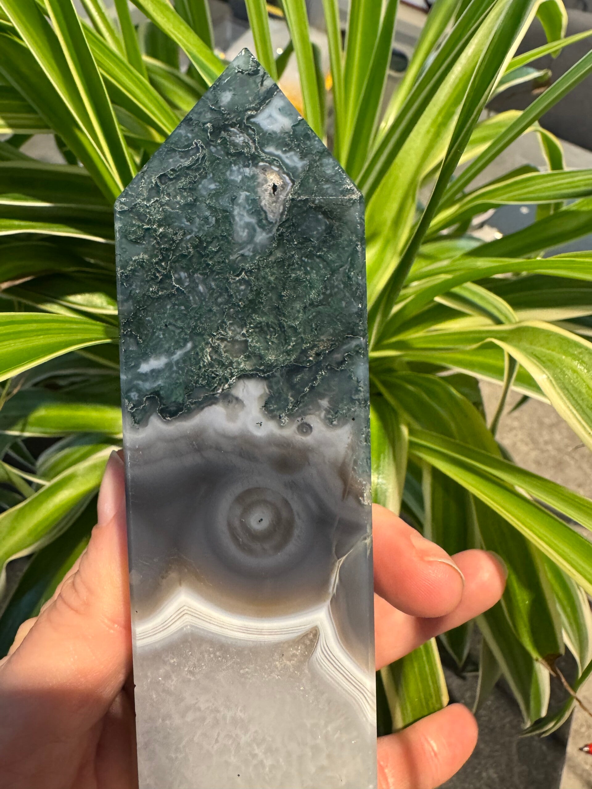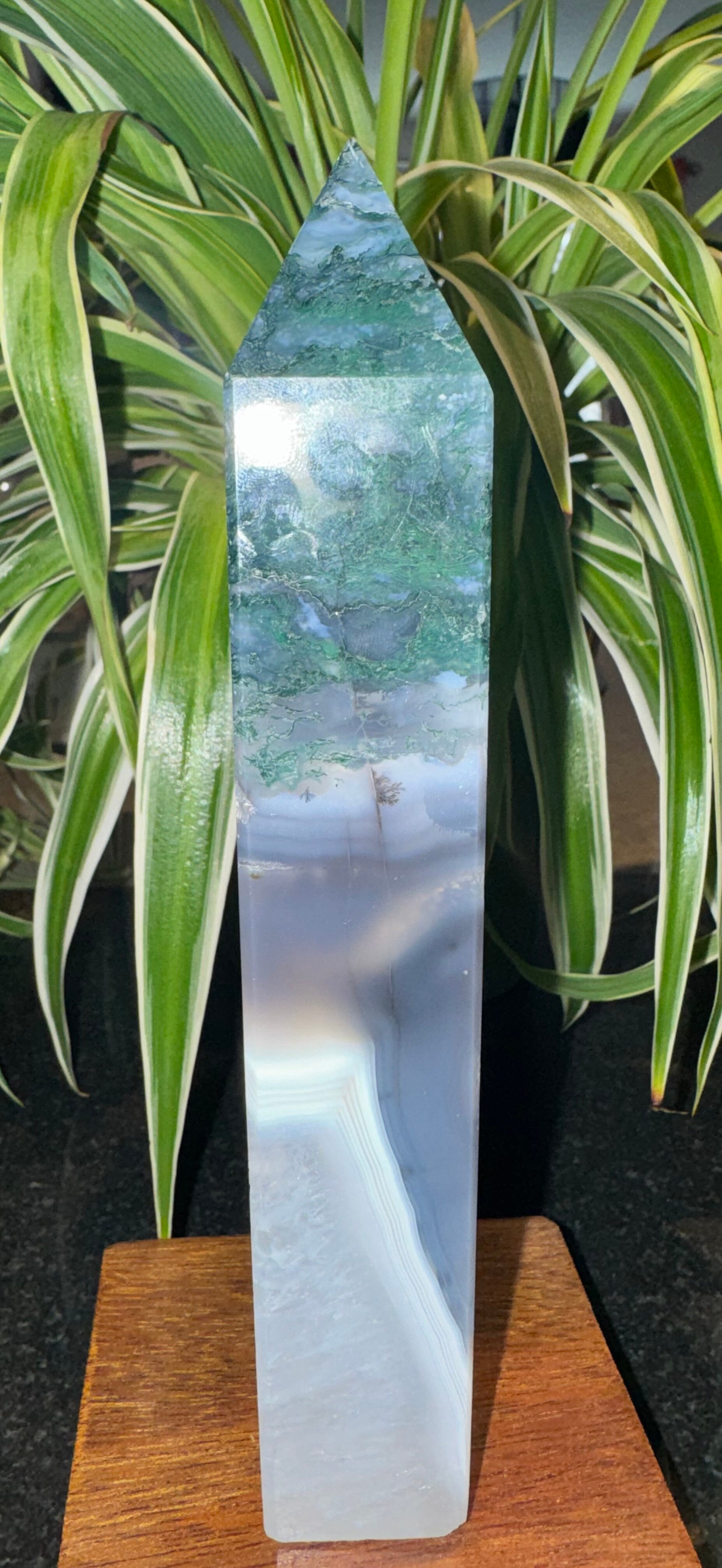 Unique Chunky Moss & Banded agate with Quartz Tower h23